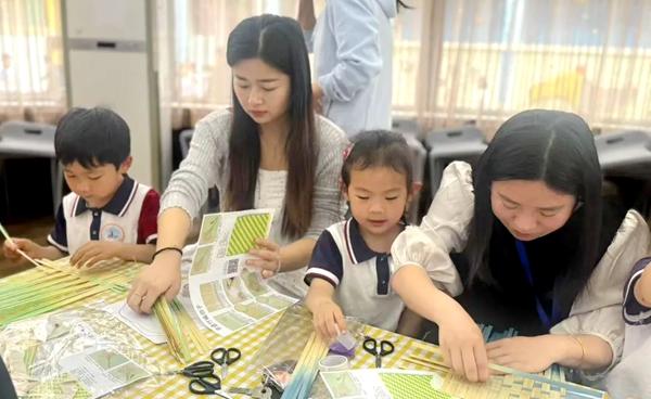 隨著早操音樂響起,孩子們化身活力小太陽,在操場上精神抖擻地舒展身體,認真的表情,整齊的一招一式,引得家長快門聲此起彼伏。“原來孩子每天早操這么投入!”。 傳統文化體驗成為活動亮點。《竹編扇》親子工坊以觀看非遺傳承人展示竹編技藝開場,當孩子們與父母親共同編織出春日扇面時,那快樂而自豪的表情已然對傳統文化寫滿仰慕之意。“這種文化傳承的方式特別有意義。”家長們紛紛點贊。