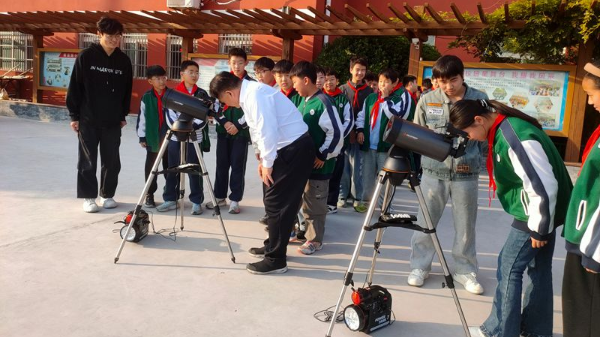 操場上,星特朗科普望遠鏡早已架設就緒。大學生志愿者們耐心指導孩子們輪流通過望遠鏡觀測太陽黑子。當孩子們清晰地看到太陽光球層上的黑子時,現場響起陣陣驚嘆:“原來太陽上真的有‘斑點’!”老師們一邊調整設備,一邊講解觀測注意事項,讓孩子們在親身體驗中感受天文觀測的樂趣。