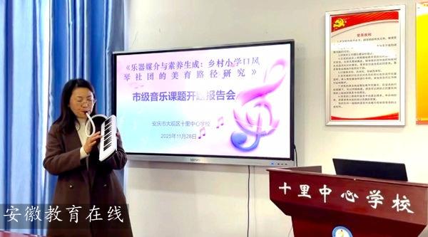 如何破解鄉(xiāng)村美育資源相對匱乏的難題,讓藝術的種子在鄉(xiāng)野間生根發(fā)芽?11月28日下午,一場聚焦于此的市級教育科學研究重點課題——《樂器媒介與素養(yǎng)生成:鄉(xiāng)村小學口風琴社團的美育路徑研究》開題報告會在安慶市大觀區(qū)十里中心學校舉行。該課題旨在探索以口風琴這一“小樂器”為媒介,撬動鄉(xiāng)村美育“大格局”,為鄉(xiāng)村教育振興提供新思路。 安慶市教研室理論研究室主任江龍林、市藝術學科教研員孫朝東等專家蒞臨指導,十里中心學校校長劉同明及課題組全體成員參會。